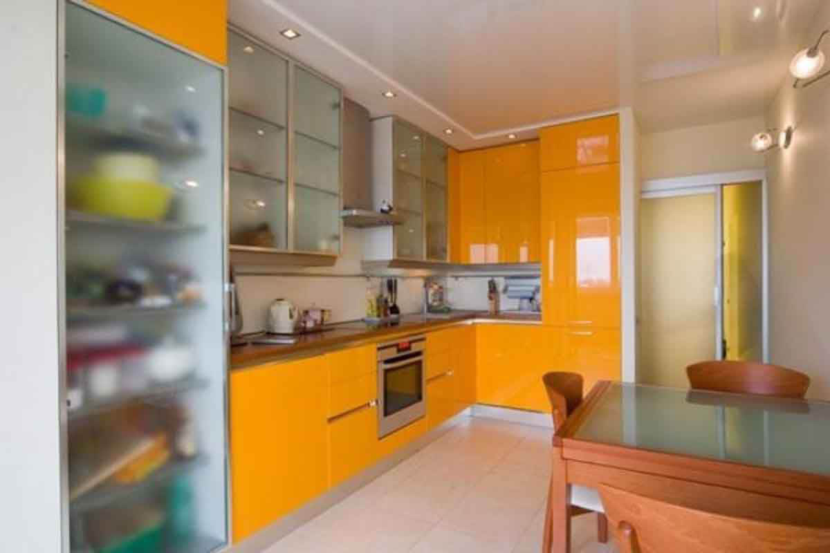 Яркий глянцевый потолок отлично смотрится с кухонным гарнитуром такой же раскраски.