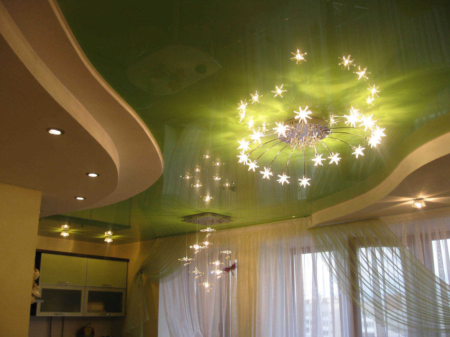 По периметру – гипсокартон или матовый потолок с освещением, внутренняя часть – глянец, гармонирующий с занавесками и узорами на полу по цвету.