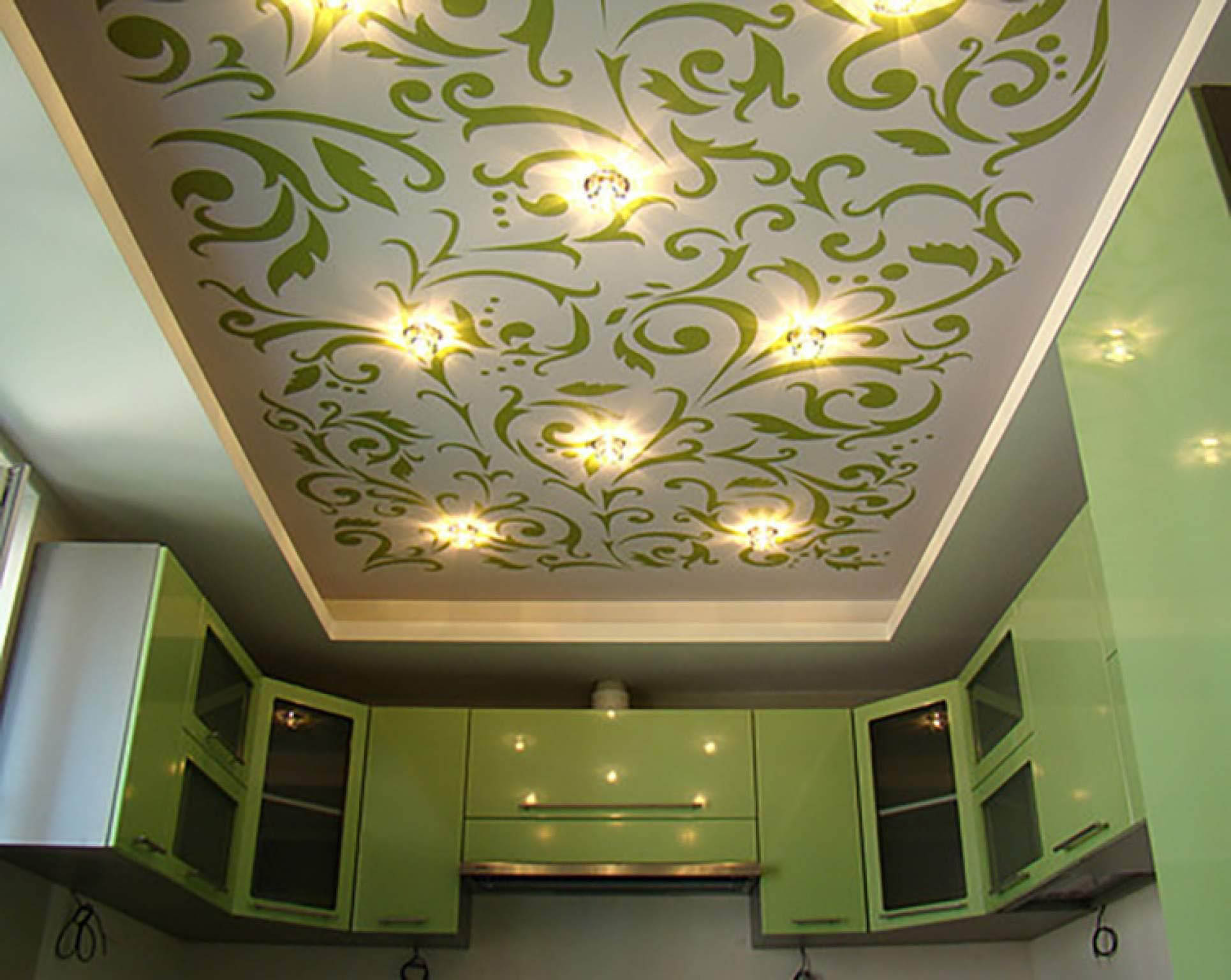 Нередки и комбинированные варианты – совместное использование гипсокартонной конструкции с натяжными полотнами. Чаще всего выступающая часть, скрывающая проводку и трубы, делается из гкл, а центральная зона отводится под натяжные потолки. Судя по следующим фото потолочных поверхностей на кухне из гипсокартона хозяева очень часто не ограничиваются таким разделением и используют дополнительную декоративную обработку потолочной поверхности – при помощи той же фотопечати.