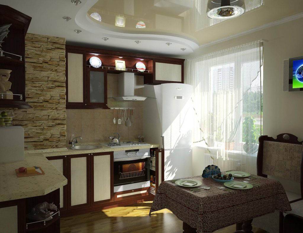 - по периметру кухни расположена гипсокартонная конструкция, в которой имеется овальное, круглое или другой формы отверстие для натяжного потолка.