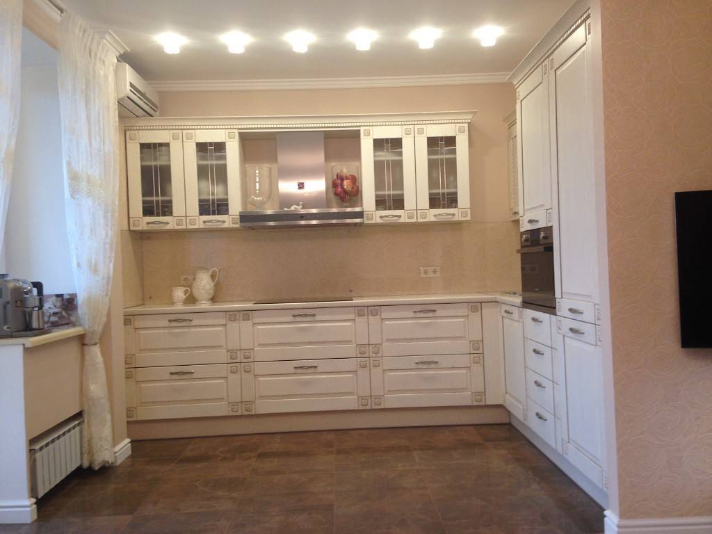 При этом перепады уровней не должны быть большими. Стык потолка и стен следует украсить потолочными плинтусами из полиуретана или гипса. Накладные элементы в виде лепнины можно использовать, если помещение кухни просторное, а сами потолки — высокие.