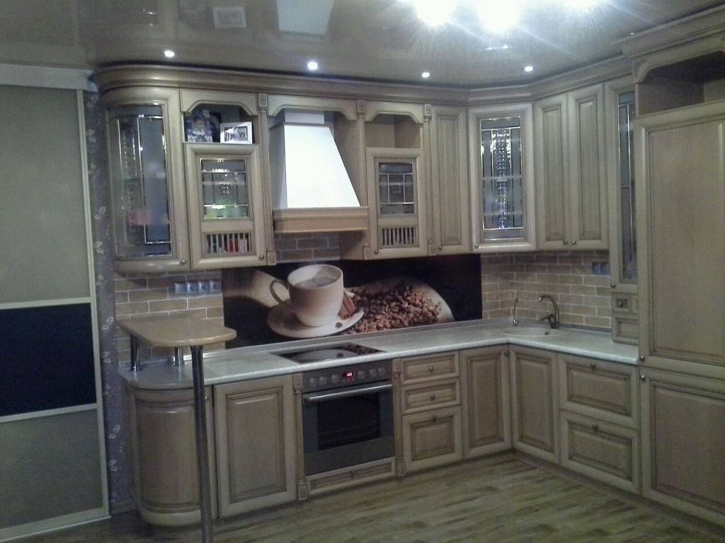 - Классический стиль подходит для просторных помещений. Он придает любому интерьеру царственности и величественности. Кухонные гарнитуры отличаются узорчатыми рисунками на фасадах, винтажными стеклами.