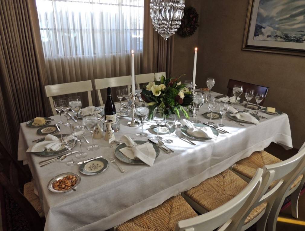 Обеденная скатерть не должна свисать больше, чем на 50-60 сантиметров от края стола. На обед и ужин можно подать к каждому прибору полотняные салфетки. Если вы практикуете традиционные семейные обеды, можно пользоваться такими столовыми аксессуарами, как кольца для салфеток, серебряные и позолоченные приборы.