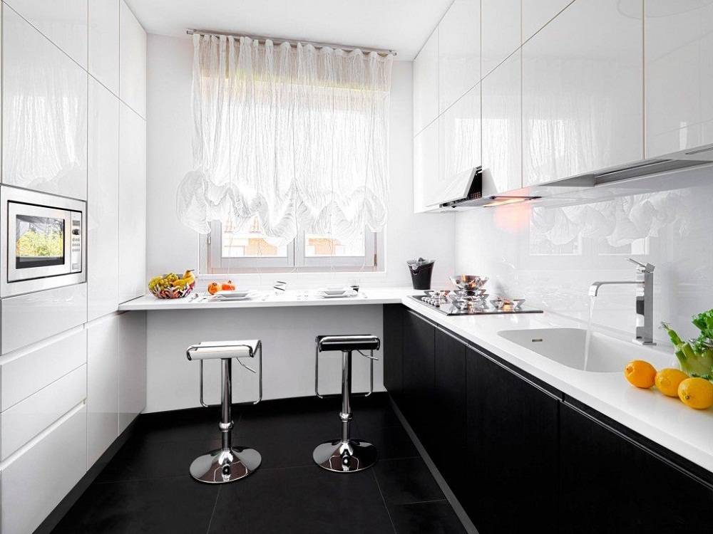 При оформлении малогабаритных кухонь предпочтительно использовать спокойные светлые тона, которые помогают визуально расширить маленькое помещение. Белый цвет всегда смотрится элегантно и аккуратно, но его использование в чистом виде на кухне не практично. В таком цвете может быть выполнен потолок, фасады и бытовая техника.