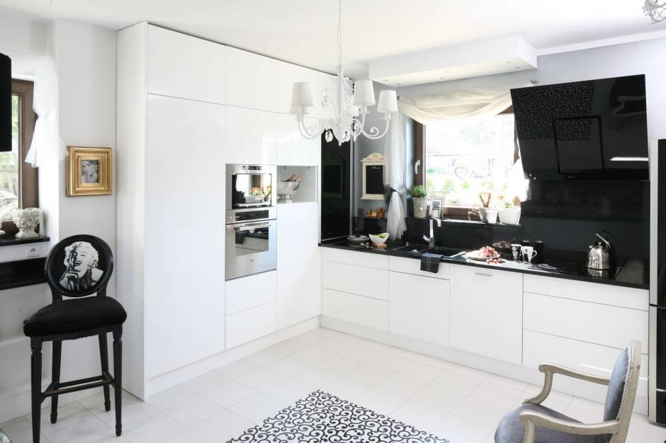 - Модульная черно-белая кухня. Выполнена из белого ЛДСП, покрыта столешницей из черного искусственного камня. Ручки, напоминающие льдинки, выполнены из полупрозрачного пластика. Такое сочетание всегда смотрится эффектно и соответствует новым тенденциям. Достаточно пары двустворчатых навесных шкафчиков с дверцами из матового стекла, 3 нижних секции, среди которых есть отсек с несколькими выдвижными ящиками. Стеклянный прозрачный стол и такие же невидимые пластмассовые стулья делают интерьер невесомым. Не нужно штор — только чистые окна, хорошо пропускающие свет. Или можно ограничиться паутинкой шифонового полотна без цвета. Люстра из нескольких ламп напоминает перевернутые стаканы, закрепленные на осколке пещерного камня.