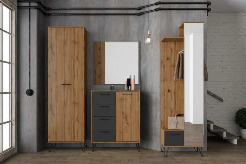 Открытые сооружения имеют ряд преимуществ: легко сразу находить на вешалке нужную одежду, а в тумбочке – пару обуви. Также они занимают минимум места, экономичны при покупке, ведь дерева на них требуется мало, и оттенок материала не будет играть особую роль (всё равно одежда будет сверху прикрывать).