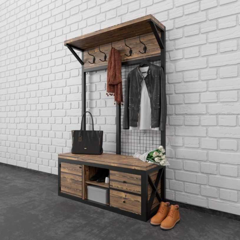 Небольшой стенд-вешалка с крючками под одежду и несколько нижних полочек под обувь;