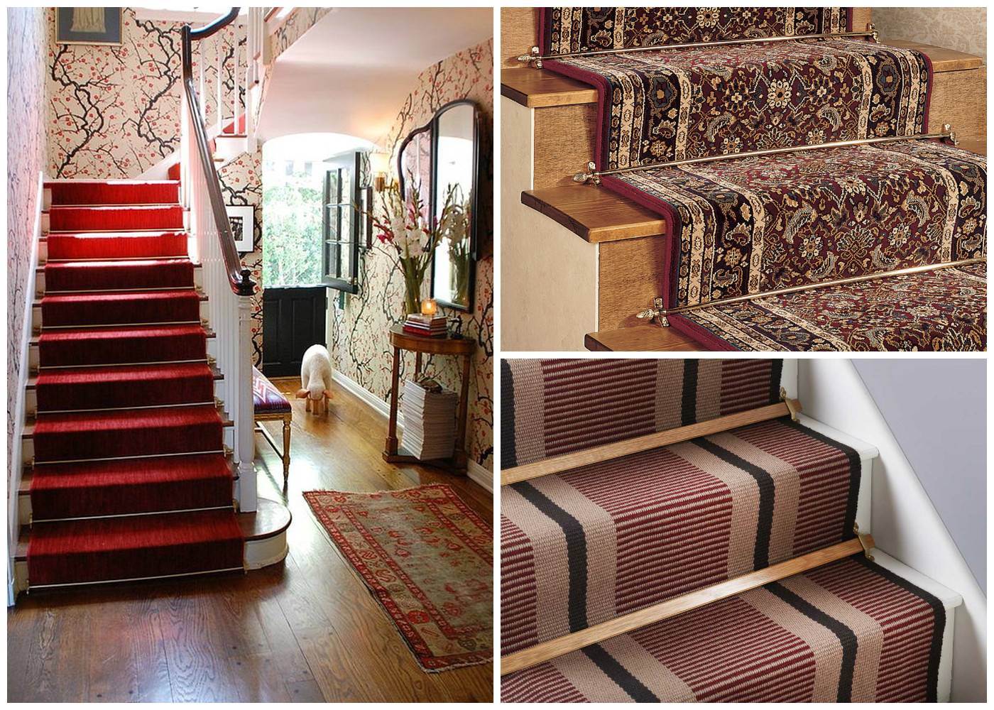 Обязательно использование специальных накладок. Это так называемые дополнительные подстилки на ступени, чтобы поверхность не была слишком скользкой. Главное, чтобы они были надёжно зафиксированы на своём месте. Ширина лестничного марша на второй этаж визуально легко корректируется при использовании соответствующих ковровых дорожек.