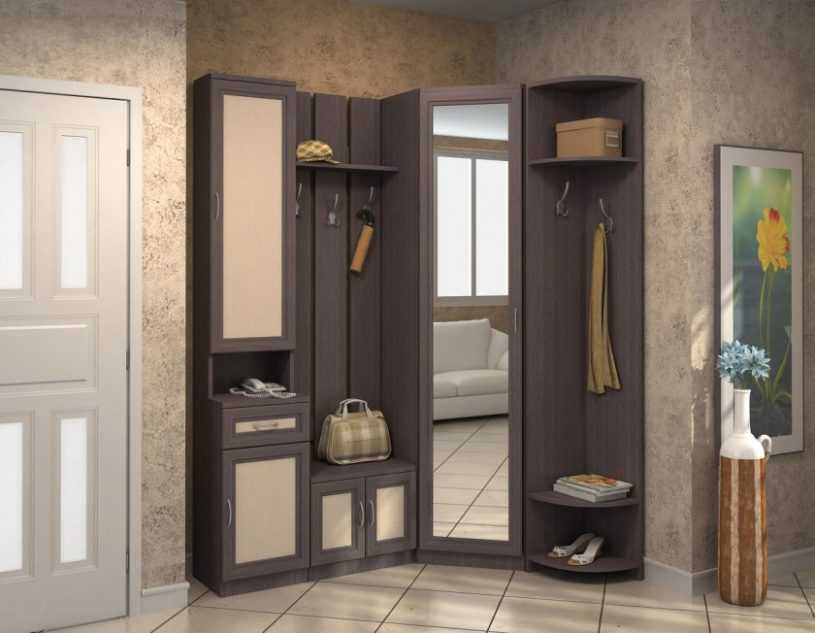 Компактно выглядят угловые конструкции. В отличие от прямоугольных моделей, они более вместительные и эргономичные. Изделие с двух сторон может быть дополнено полками, тумбами или специальными обувными секциями.
