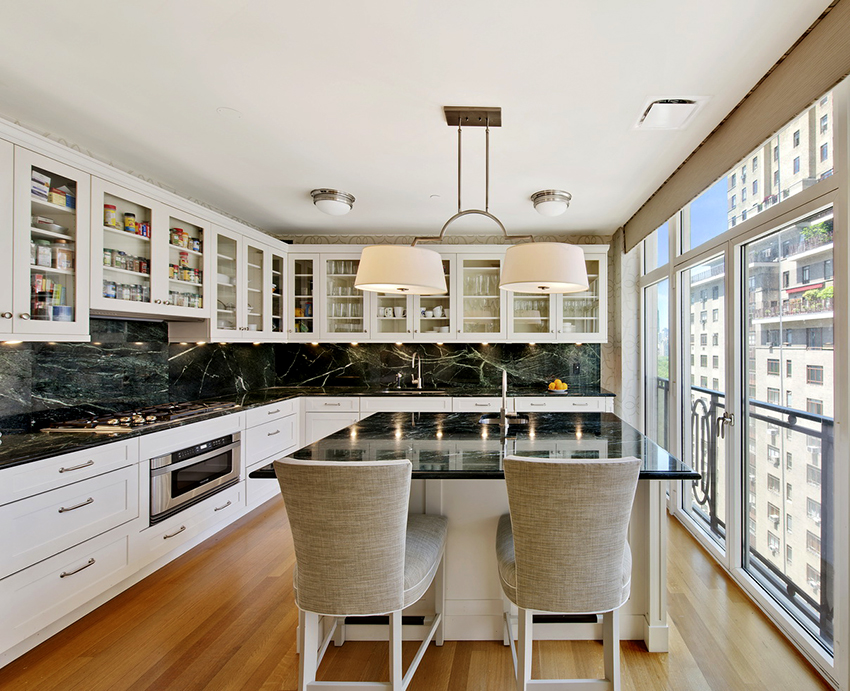 - Для обустройства полноценного обеденного пространства лучше подходит прямой гарнитур, освобождающий место для стола, стульев или кухонного диванчика.