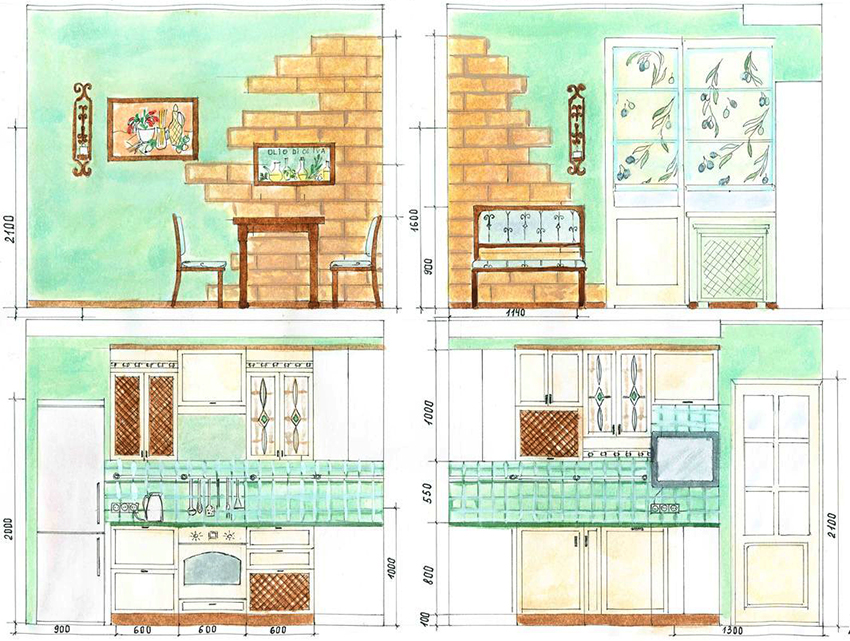 Второй этап создания эскиза кухни: развертка стен