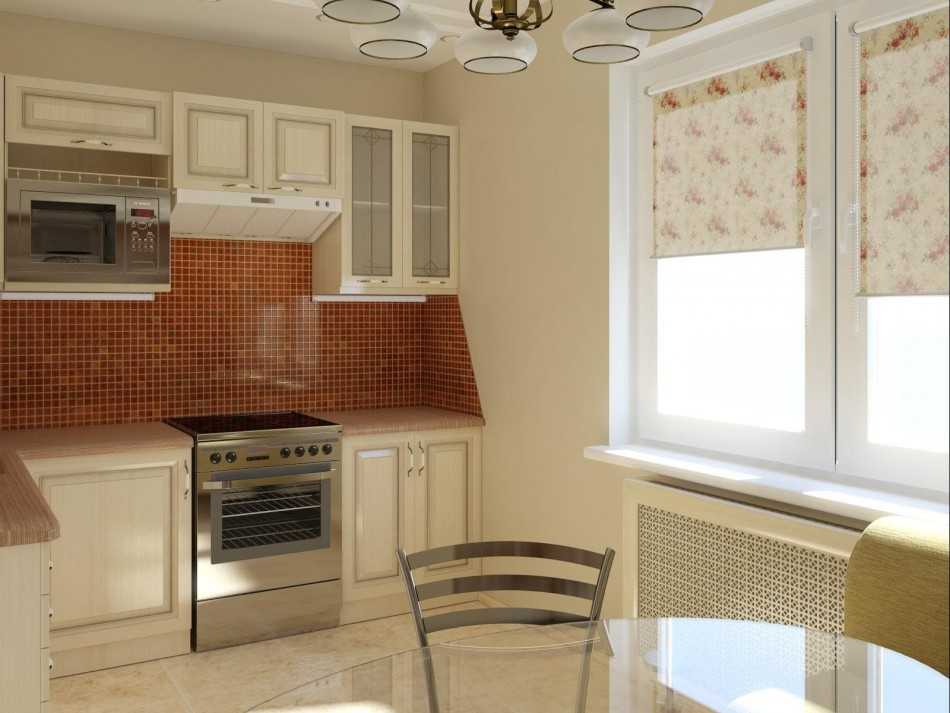 Чтобы вписать угловой гарнитур в маленькое пространство, можно задействовать зону под окном, выходящим на лоджию. Для этого нижнюю часть проема закладывают до уровня рабочей столешницы, вдоль перегородки располагают полезные шкафчики для хранения. Обеденная мебель в таком случае устанавливается у противоположной стены.