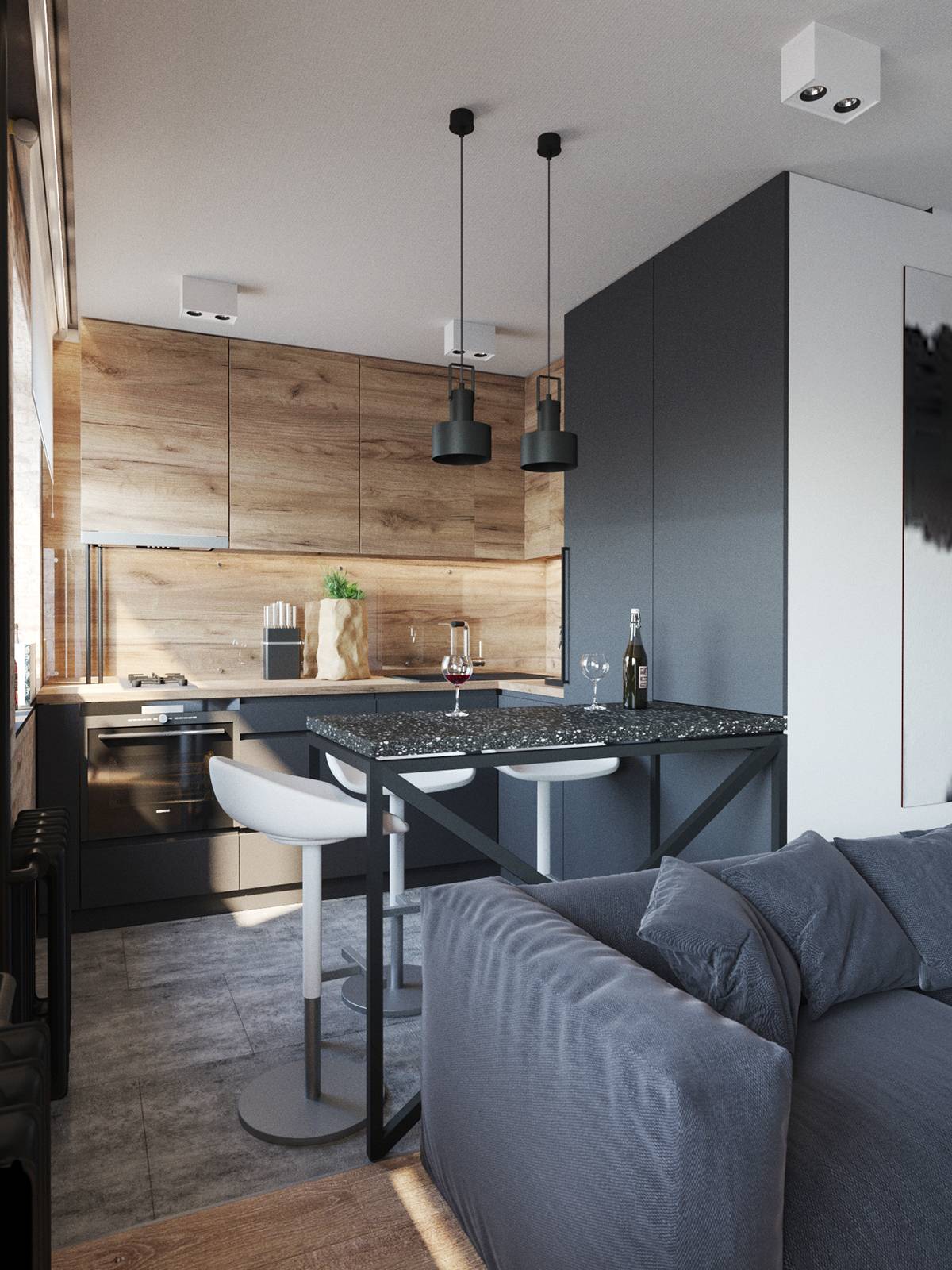 - Выбирайте многофункциональные предметы мебели. Угловой гарнитур можно укомплектовать барной стойкой, за которой удобно принимать пищу, если выбрать подходящие стулья.