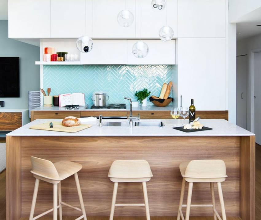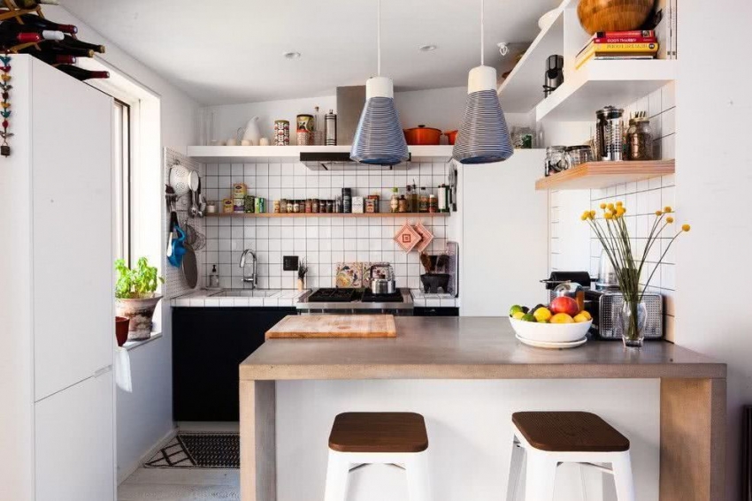 Использование барной стойки вместо стола сэкономит пространство и придаст кухне некоторую изюминку на современный манер.