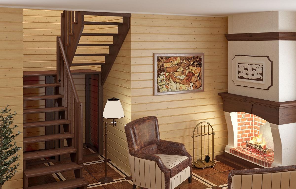 - П-образная поворотная лестница с закрытыми деревянными ступенями и деревянной балюстрадой;