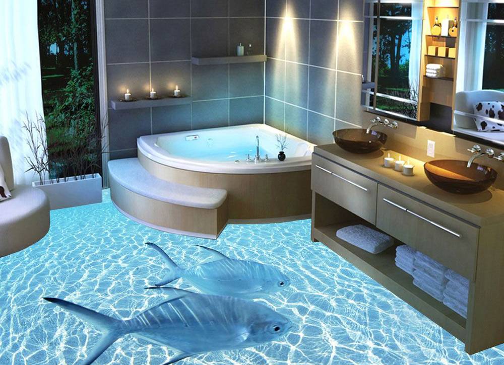 Очень популярны стали 3D-полы, которые предполагают укладку баннерной пленки/ткани с изображением на основание, а сверху заливку прозрачным полимерным покрытием. Также можно укладывать разные камни, цветы, монетки, травы, создавать узоры и орнаменты.