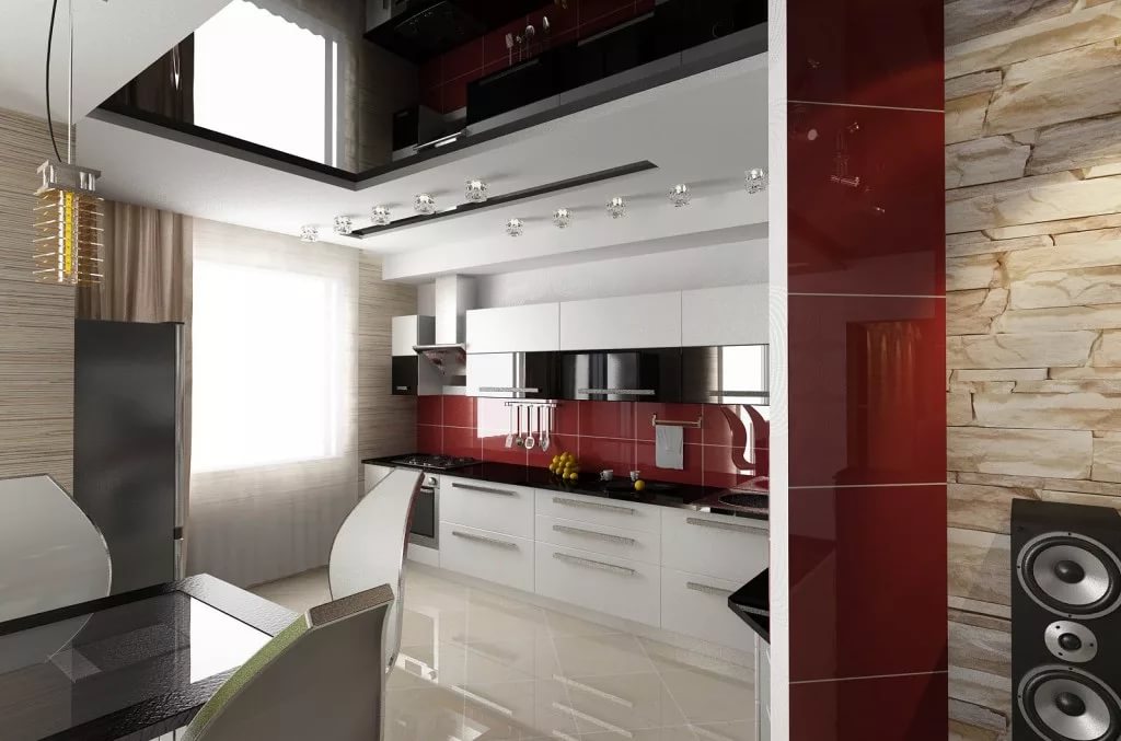 Хорошим решением станет применения зеркальных поверхностей, которые отражают свет и создают дизайн современной кухни. Вместо занавесок и штор рекомендуется устанавливать рулонные шторы или жалюзи для лаконичного дизайна кухни 9 кв. м.