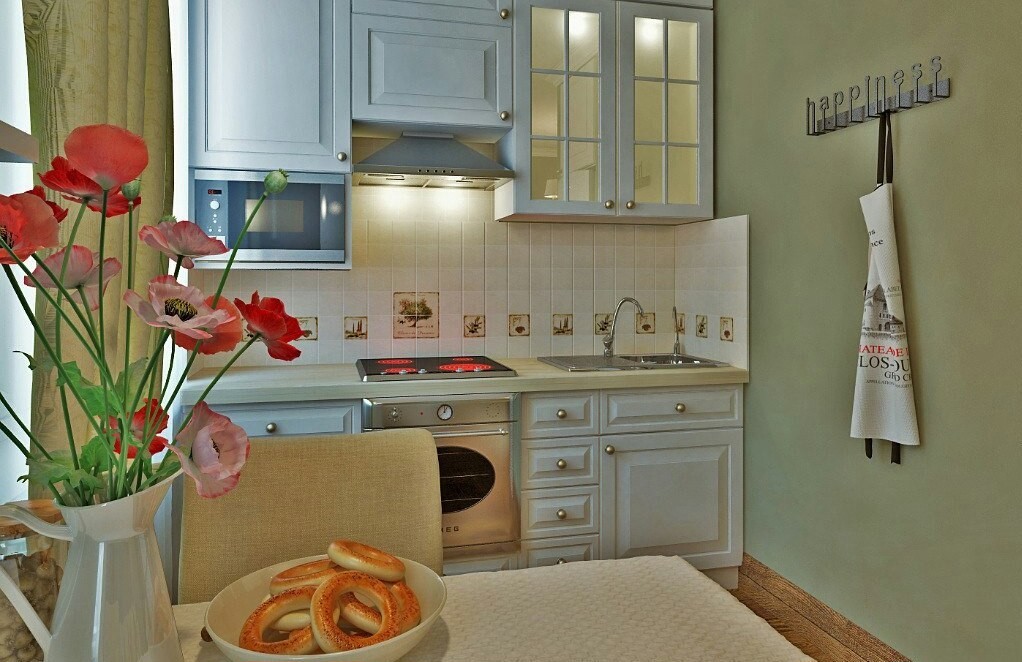 Для владельцев девятиметровых кухонь телепередача «Квартирный вопрос» предложила свой проект. Интерьер кухни выполнен в белых оттенках. Они визуально расширили помещение, наполнили его светом, привнесли в дизайн легкость и уют. Разбавили обстановку живые цветы и красочные принты. Встроенные светильники наполнили комнату светом, не оставляя затененных мест.