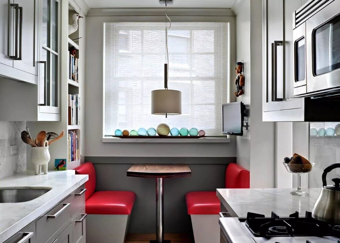 Если в кухне есть выход на балкон, можно объединить эти помещения. Или же, утеплив балкон, вынести туда обеденную зону.