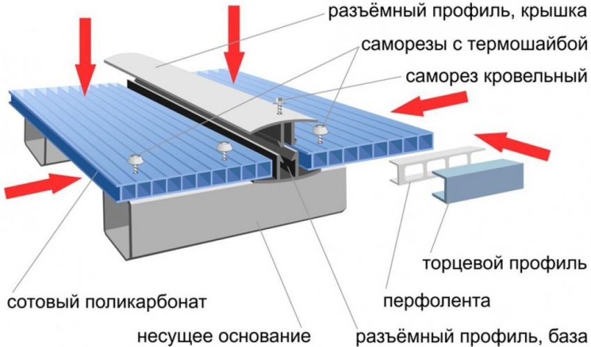 Рассмотрим крепление поликарбоната на различные конструкции.