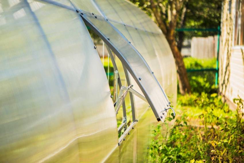 В солнечные дни пленку поднимают для проветривания растений. Возможно использование поликарбоната, который вставляется в цельный металлический каркас.