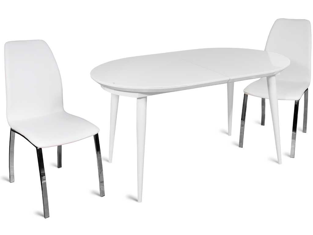 На фото небольшая кухня в светлых тонах с овальным выдвижным столом белого цвета.