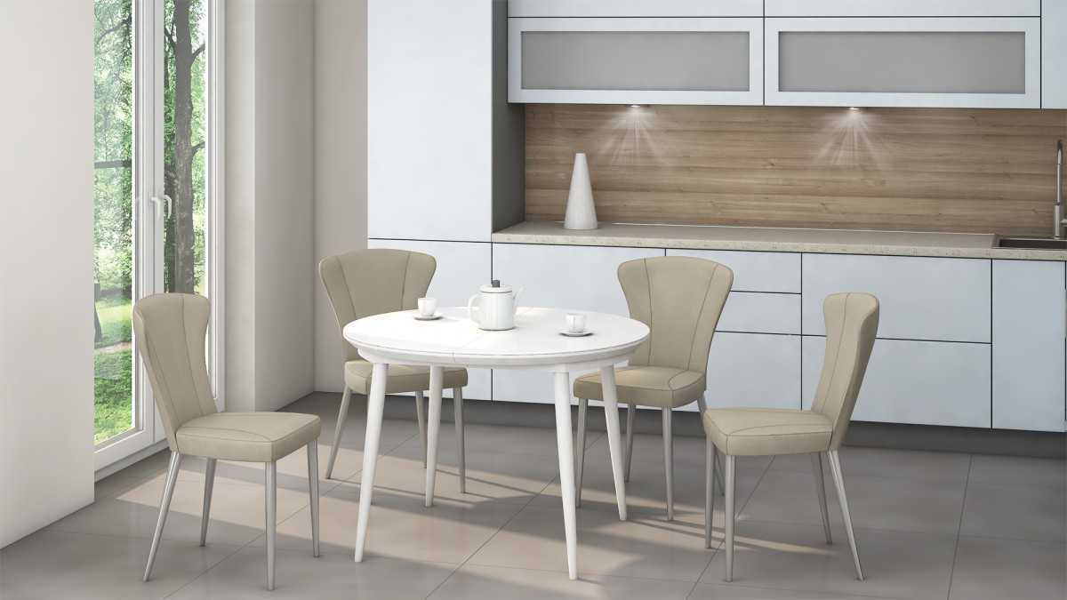 Для небольших помещений, где устанавливается обеденный стол (кухня, гостиная или отдельная столовая), круглая конструкция смотрится практично и привлекательно. Она занимает меньше места и позволяет удобно разместиться вокруг.