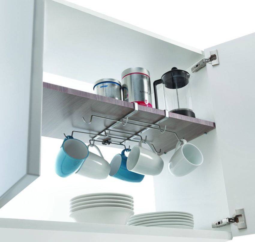 Рейлинг для хранения чашек можно расположить внутри подвесного шкафа