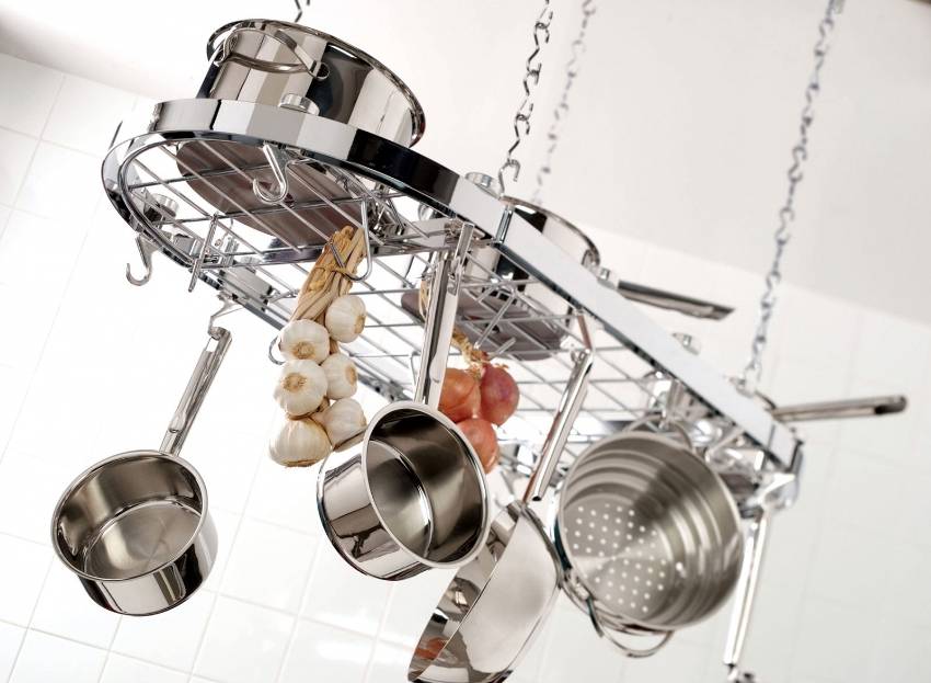 Подвесные рейлинговые системы напоминают сетку или решетку, их располагают над кухонным островом. Чаще всего их закрепляют с помощью цепей. На такой конструкции размещают ковши, сковороды, дуршлаги и другую посуду.