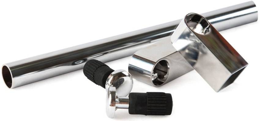 Самый простой комплект рейлинга представлен металлической трубой, набором креплений и заглушками. Если это угловая модель, здесь дополнительно предусмотрены поворотная труба, выполненная под углом 90 или 135 град, и переходные муфты.