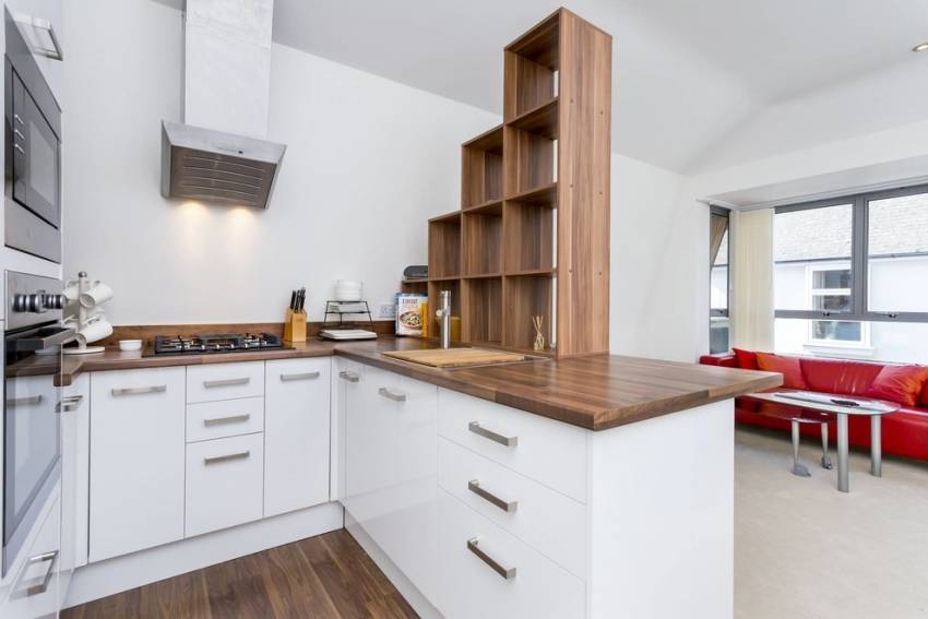 Сегодня приветствуются квартиры-студии. Поэтому владельцам жилья небольшого размера стоит отказаться от обычной кухни, представляющую собой единственную комнату. Между функциональными зонами нужно стереть границы. Этим существенно увеличиваются объёмы кухни.