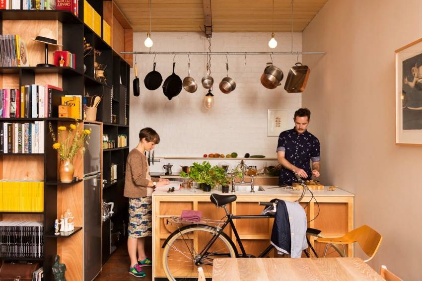 Пример зонирования кухни в квартире-студии с помощью полок-стеллажей