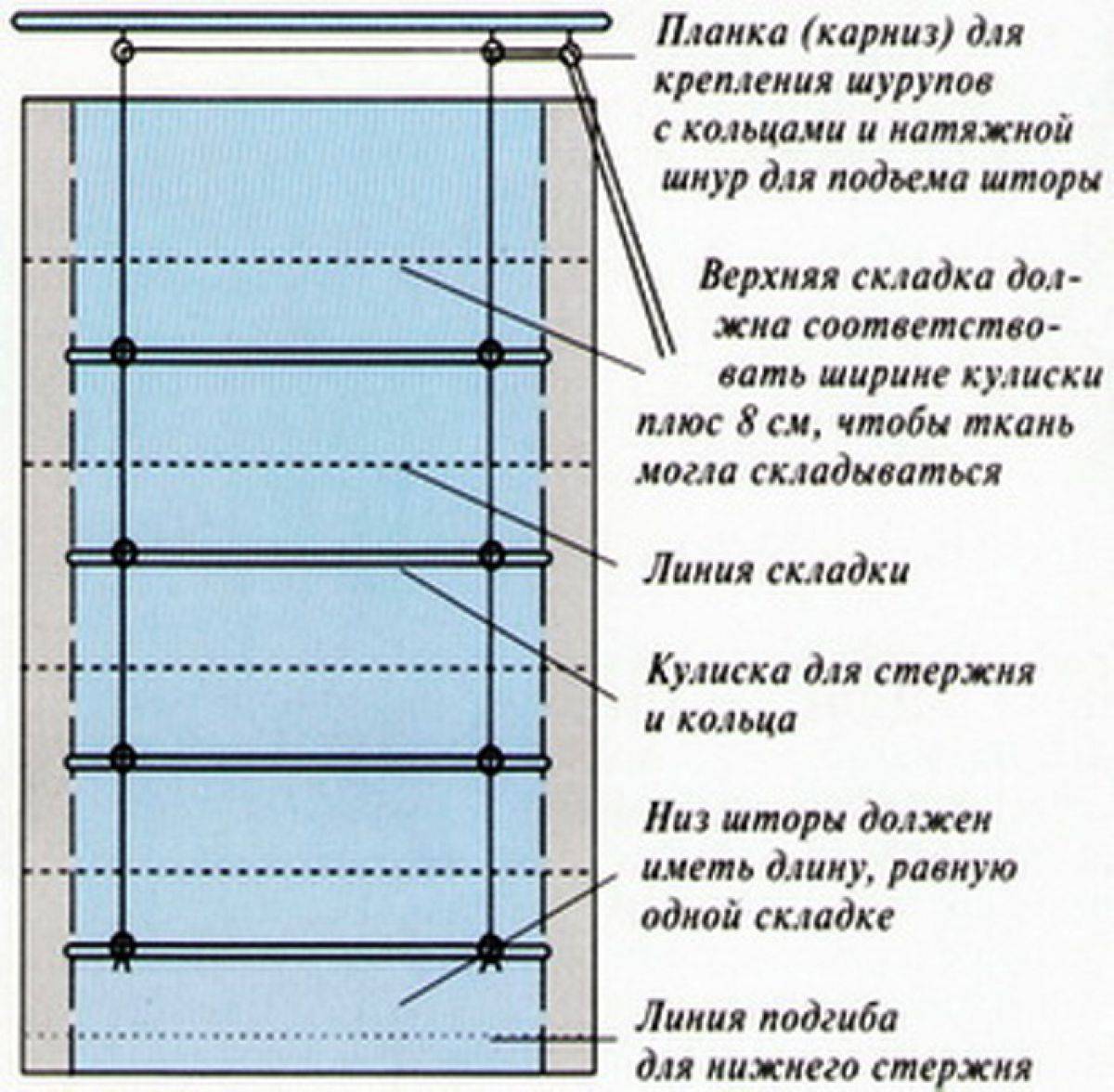 При крое ткани важно не забыть припуски на швы, и лучше всего выполнить влажно-тепловую обработку материала, чтобы предотвратить последующую усадку и возможность перекоса полотна. Крепят шторки на карнизы посредством вшитых колец и протянутых сквозь них шнуров. Далее шнуры стягивают по месту, распределяют систему складок, после чего шнуры фиксируют, связывая прочным узлом