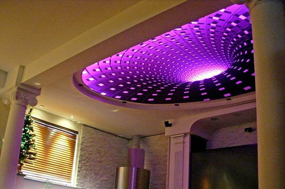 Для освещения натяжных 3д потолков используют различные виды внутренних и внешних светильников: