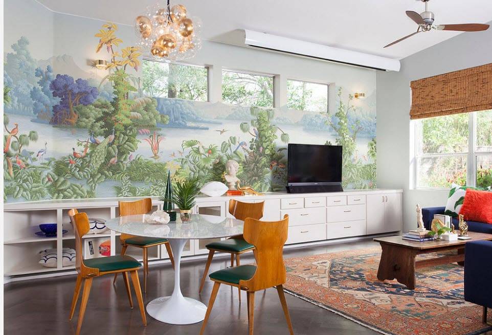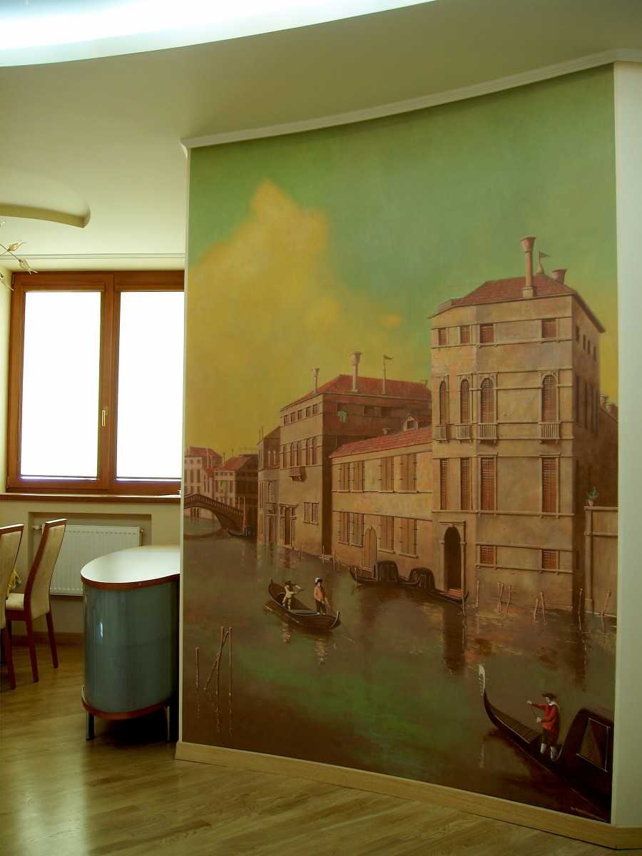 Старая классика. Это фрески, пейзажи, старинные улочки, море, деревенская тематика, натюрморты. Такие изображения не только создают акцентную стену, но и зрительно раздвигают ее границы и формируют ощущение легкости.