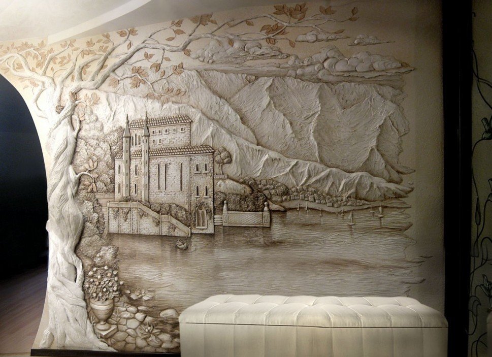 Не менее красивые варианты росписи стен получаются при использовании декоративной штукатурки. Благодаря ей рисунок получает дополнительный объем и выразительность.
