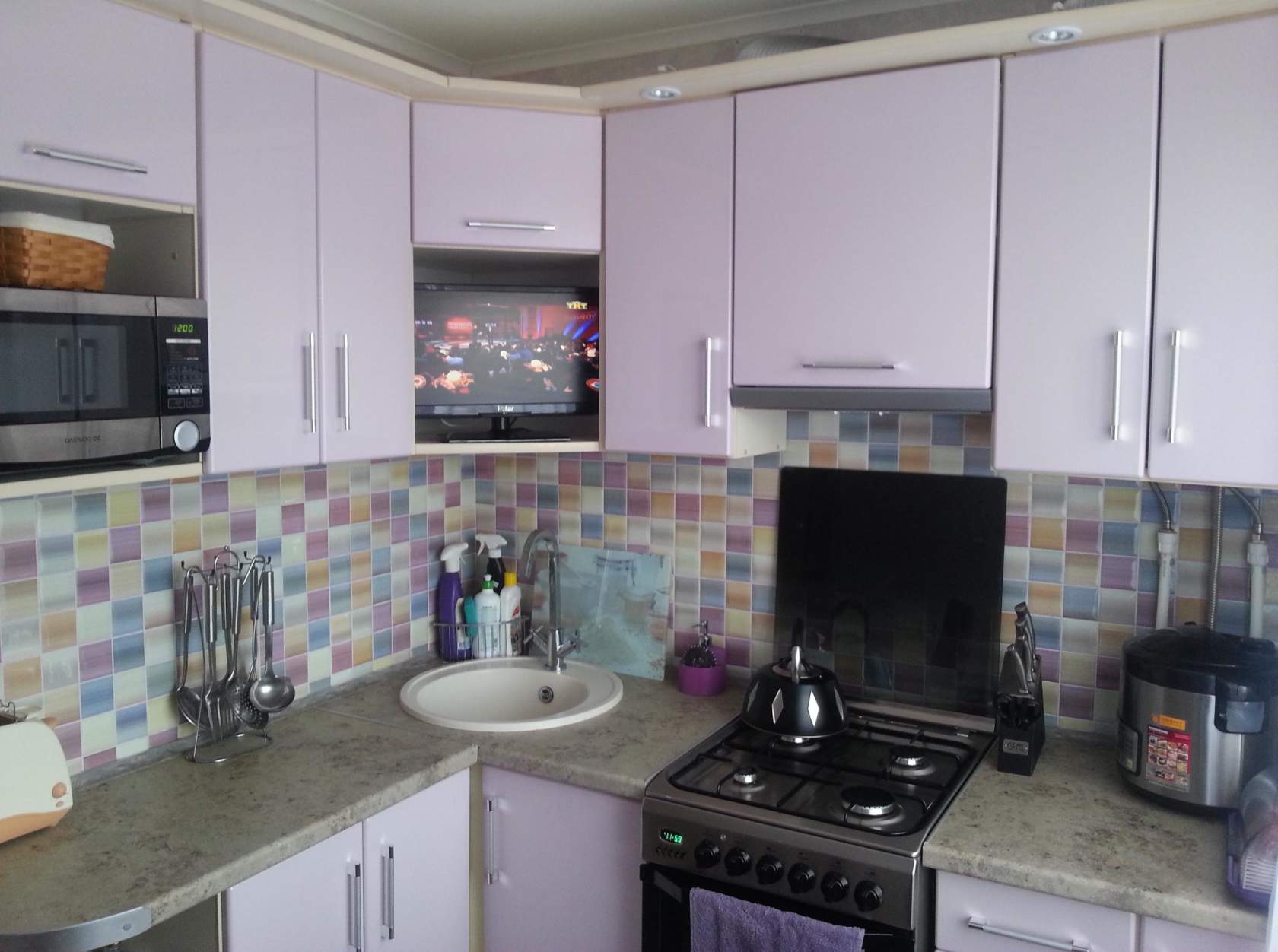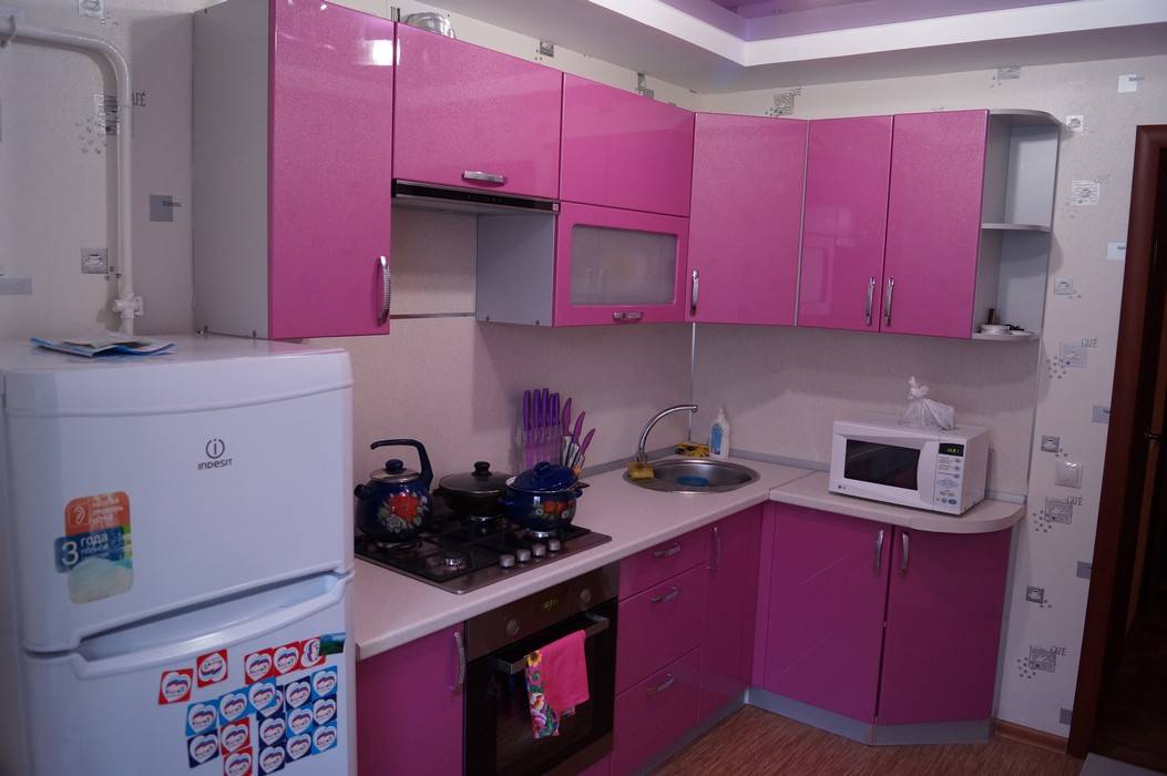 Гармоничная, интересная и завораживающая комбинация. Розовый идеально дополняет сиреневый и добавляет кухне изящности и изысканности.