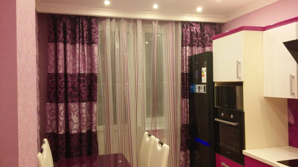Из материалов предпочтительны легкие, натуральные ткани – хлопок, лен или тюль. Исключением для кухни станут их синтетические имитации. Неплохой заменой или дополнением занавесок будут короткие прямые ламбрекены.