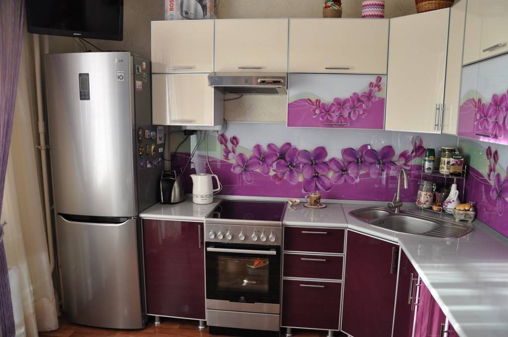 Если же окна кухни выходят на юг, то вы можете выбирать холодные тона: лавандовый, малиновый, маджента, фуксия и пр. как на следующих фото.