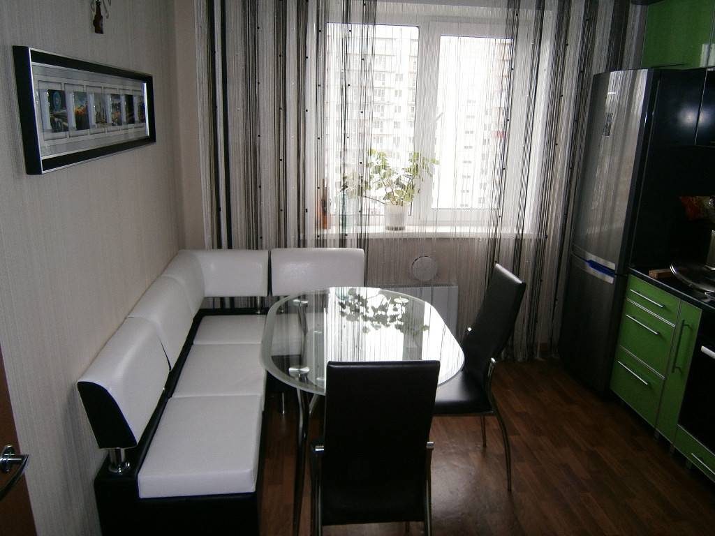 Прямо перед ним можно установить длинный обеденный стол. Со стороны стены рекомендуется установить диванчик такой же длины. Стулья, расположенные со стороны гарнитура, должны быть легкими, чтобы их можно было без особых усилий задвинуть под стол (так они не будут мешать при передвижении по кухне).