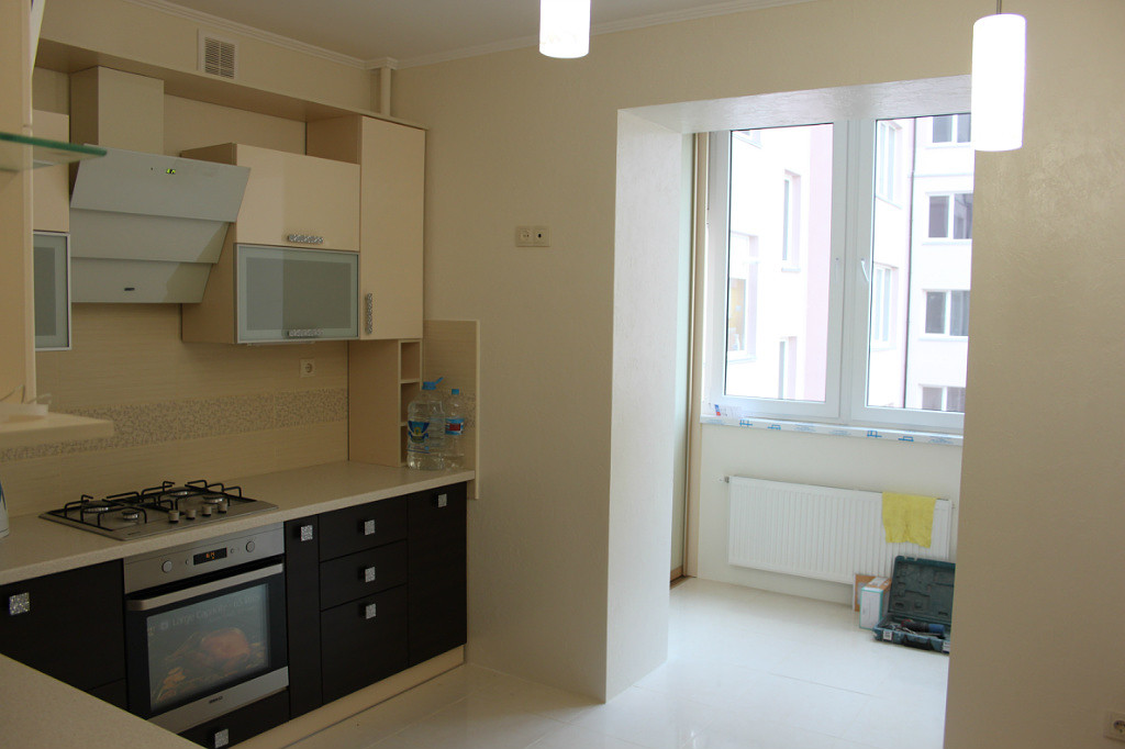 Если есть балкон, можно сделать перепланировку помещения — нужно просто убрать стену. Разрушать ее полностью не стоит, можно оставить нижнюю часть (до подоконника), соорудив из нее барную стойку. Она может выполнять роль обеденного стола, таким образом, на кухне появится больше свободного места.