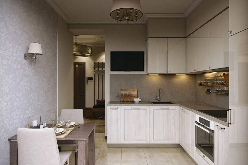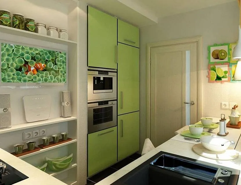 Небольшую панель на кухне в 8 кв. встраивают в гарнитур. Оригинально смотрится техника, спрятанная за дверцами в шкафу или на фасаде мебели. Удобно расположить ТВ на одной из стен или в специально оборудованной нише. Плоский экран вставляют в рамку картины или подвешивают под потолком.