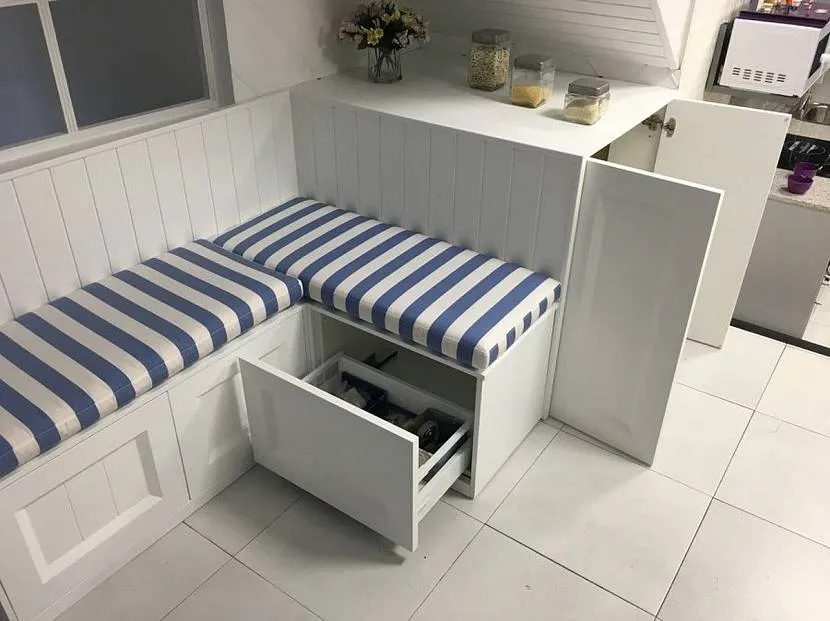 На кухне в 8 м. систему хранения часто совмещают с мягкой мебелью. Небольшая тахта с откидным верхом или выдвижными ящиками, в которых прячут посуду или сыпучие продукты. Легкий придвижной стол не мешает доступу к импровизированной тумбочке.