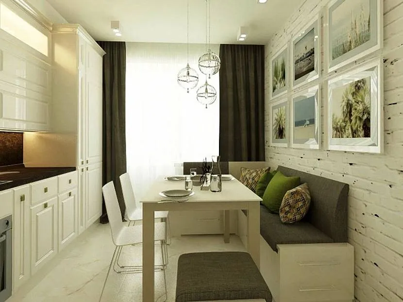 На кухне на 8 кв. используют компактный мягкий уголок. Мебель располагают рядом с окном и гарнитуром (рабочей зоной). Чтобы увеличить полезную площадь, нужно демонтировать подоконник. У модели больше посадочных мест, чем у традиционного дивана. Рядом ставят стол-трансформер.