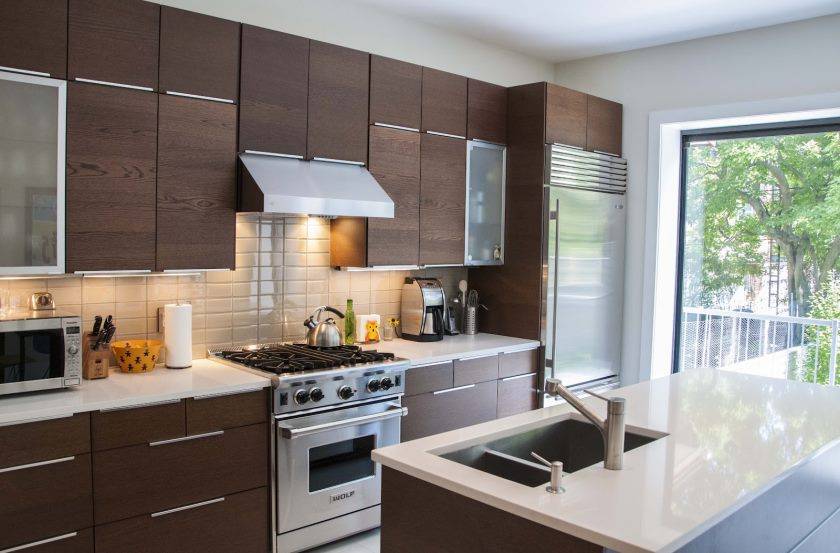 Черно-коричневый цвет фасадов уместен в просторных помещениях с большим количеством света. Разбавить избыток темноты помогут белоснежные либо яркие стены, узорчатый или цветной кухонный фартук, стулья для кухни, столешница и другие горизонтальные плоскости пастельных тонов и, конечно же, светлые оттенки дерева.