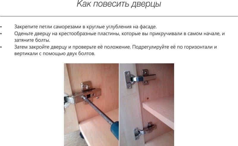 Для этого на дверцах устанавливают петли и закрепляют саморезами. Затем навешивают створки на крестообразные пластины и прикручивают. С помощью 2 болтов на дверной петли регулируется положение дверцы: она должна легко открываться и закрываться и висеть ровно.