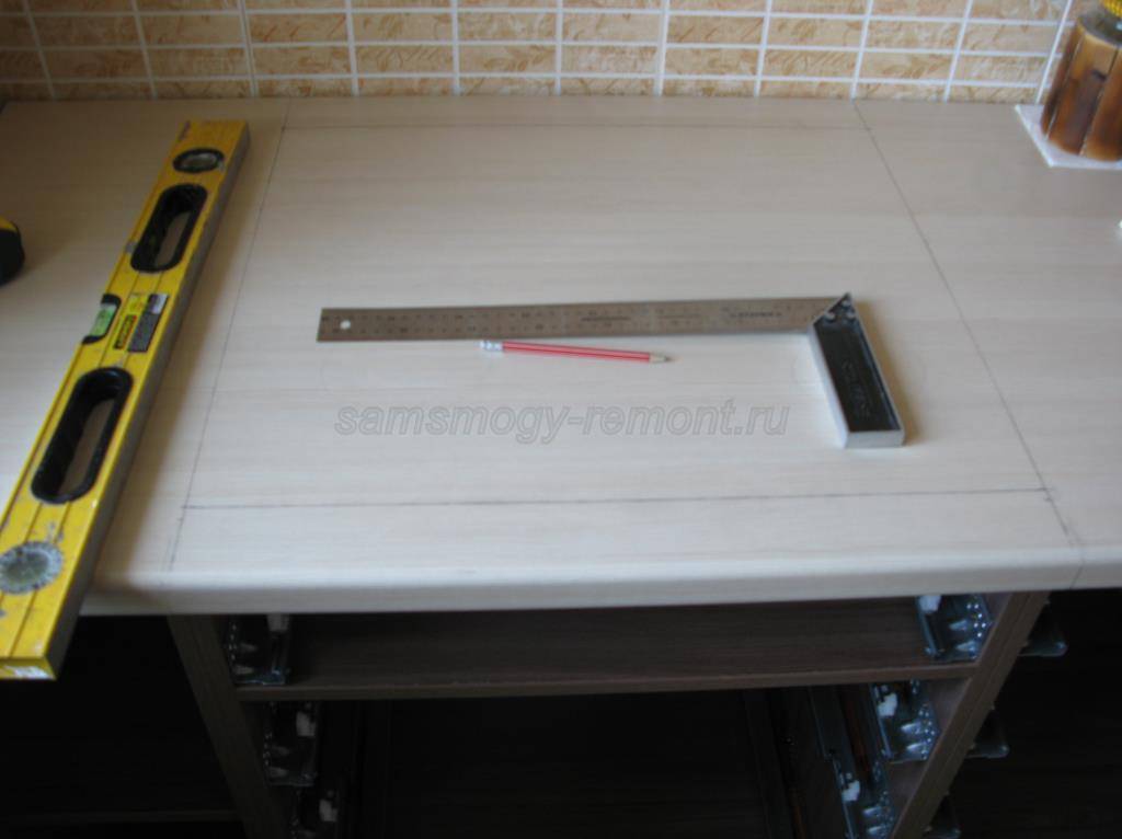 - Теперь делаем внутреннюю разметку, исходя из того, что мойка должна встать на столешницу с некоторым запасом после прорезки окна, и её отбортовка перекроет зазоры. Последние нужно производить внимательно, ни на что не отвлекаясь, чтобы не испортить дорогостоящую столешницу.