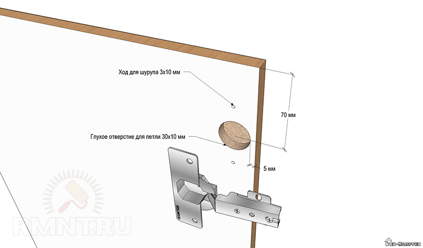Петли устанавливаются в выбранные на дверках специальные отверстия (гнёзда) и через монтажные отверстия крепятся к полотну шурупами. Гнёзда при их отсутствии высверливаются плоским сверлом диаметром 30 мм, на глубину 10 мм, от края дверки отступается 5 мм, а от верха и низа по 70 мм.