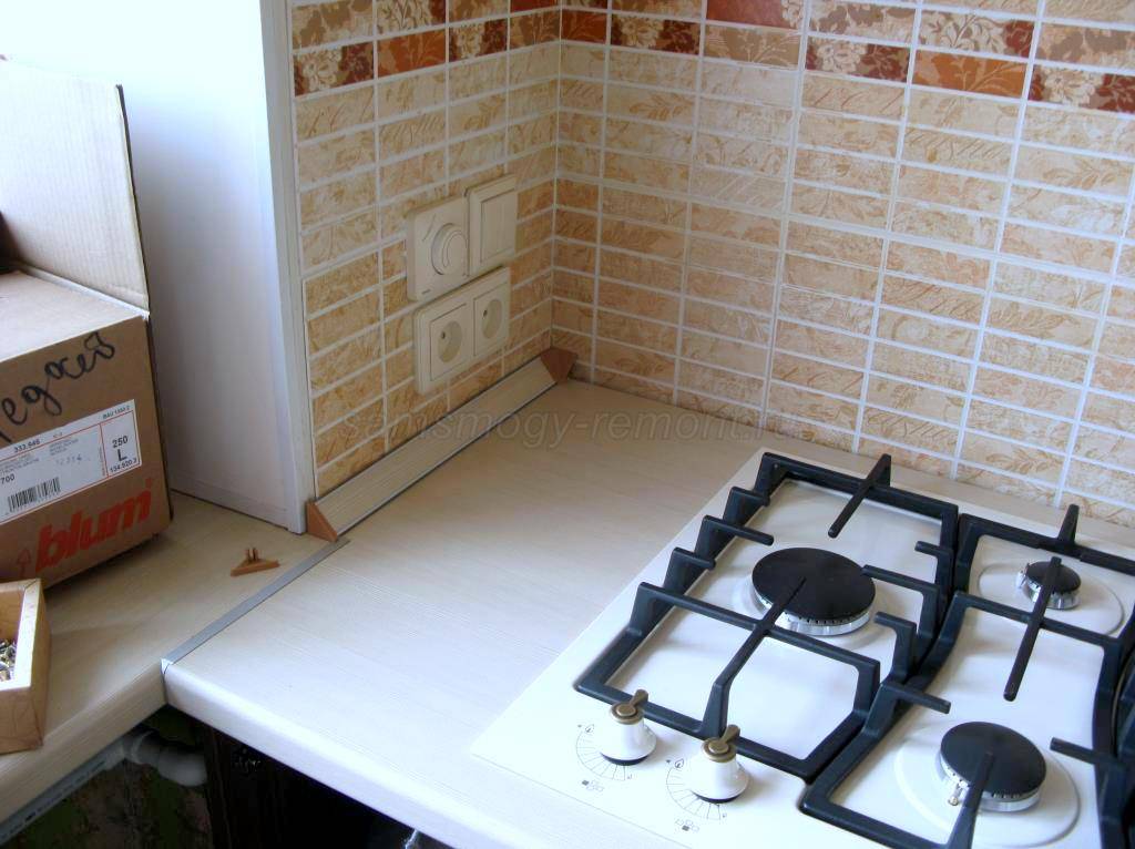 Поверх шкафов кладется столешница, если она немного больше требуемой длины, то можно отрезать кусок при помощи электролобзика. Край столешницы обязательно нужно отделать, чтобы влага не разрушала её. Для этого можете приобрести в любом строительном магазине силикон в тюбике и промазать место, где делался надрез. Когда силикон высохнет, а это произойдет приблизительно через полчаса, он образует резиновое покрытие, способное предотвратить попадание влаги.