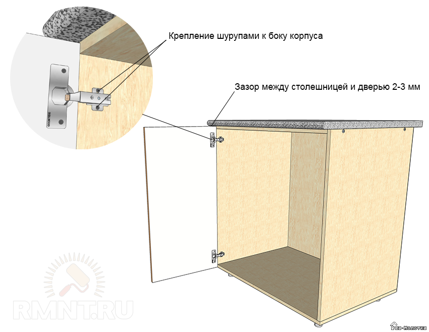 Между столешницей и верхом дверки должен оставаться зазор 2–3 мм.